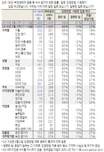 | OOOO | ‘김영란법’ 적용 대상에 사립교원 포함 ‘잘된 일’ 61%, 언론인 포함 ‘잘된 일’ 65%, 국회의원 예외 조항에는 68% 반대. 국가 경제에 ‘긍정적’ 41%, ‘부정적’ 12%, ‘영향 없을 것’ 29% h… |