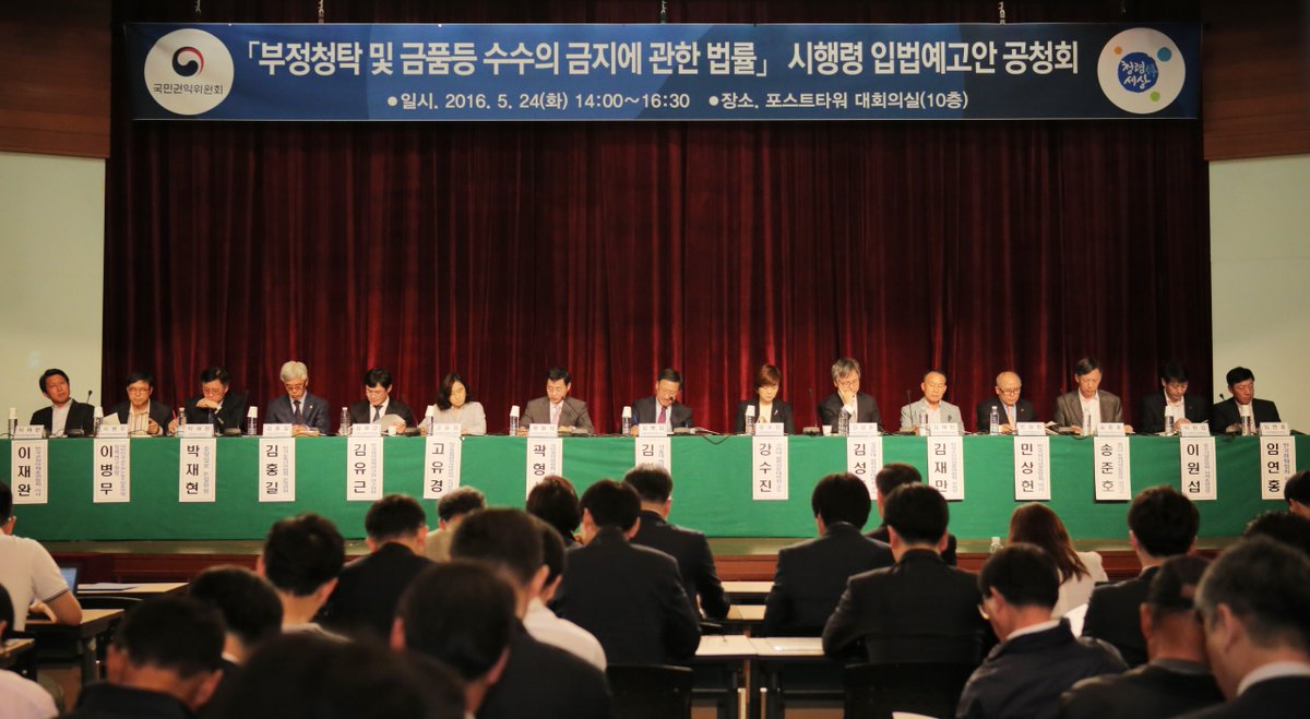 | OOOO | #권익위 #김영란법 시행령 입법예고안 공청회는 서울대 김병섭 교수 진행으로, 법적용 대상인 공직자, 언론인, 교원 및 학계, 관련 업계, 재계, 학부모단체, 시민단체 등 각계각층을 대표한 13명의 토론자 참여 |
