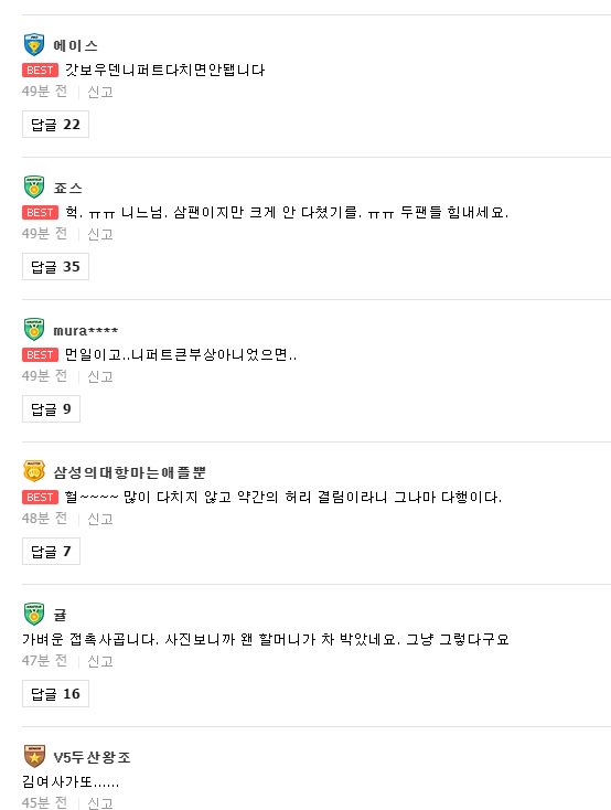 OOOO | 오늘 두산 선발이었던 니느님 니퍼트 선수 교통사고 났다고하니 두산팬분들 ㅋ '후유증 되게 오래갈텐데...'하면서 댓글을 많이 다네. ㅎ 니느님 ~ 제발 다음 선발때까지 몸관리 잘해서 8승따시길~! |