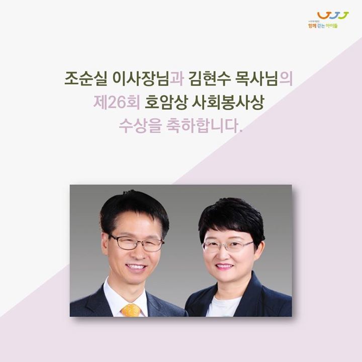 | OOOO | [조순실 이사장님, 호암상 사회봉사상 수상] 함께걷는아이들의 조순실 이사장님과 부군인 김현수 목사님께서 제26회 호암상 사회봉사상을 받으십니다. ㅡ 청소년 복지사업에 대한 필요성과 가치를 지역사회에 공유… |