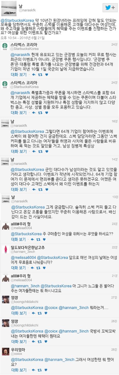 OOOO | 박그네가 군인 특별휴가 주면서 전경련 갈궈서 쿠폰을 같이 뿌림 -> 스타벅스 울며겨자먹기로 쿠폰을 오늘의커피(가장 싼거)로 교환해 줌 -> "왜 여자는 공짜커피 안주냐! 스타벅스 여혐이네!" 근데 쿠폰교환 벌써 1년전 이야기… |