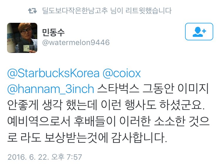 OOOO | 이거 스타벅스 코리아 해명을 읽어보니까 스벅에서 주는 것도 아니에요. 작년 국군의 날 기념으로 군인들한테 휴가 때 쓸 쿠폰을 전경련에서 지급했는데 사용처 중에 스벅이 있는 거예요 |
