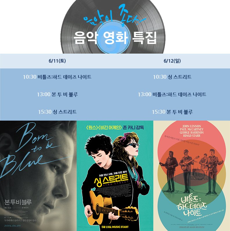 OOOO | 6/11~12 '음악이 좋다' 음악영화 특집! 이번주 명필름아트센터 영화관에서 <본 투 비 블루>, <싱 스트리트>, <비틀즈하드 데이즈 나이트>가 연속 상영됩니다. #명필름아트센터 #음악이좋다 t.c… |