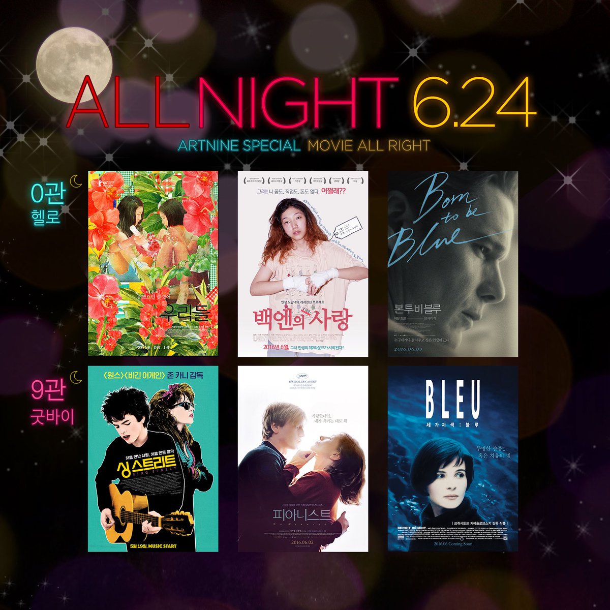 OOOO | 아트나인 올나잇 헬로&굿바이 6월! 헬로-우리들, 백엔의 사랑, 본 투 비 블루 굿바이-싱 스트리트, 피아니스트, 세 가지 색 블루 예매가 오픈되었습니다! 예매는 메가박스 홈페이지 및 모바일앱으로. t.c… |