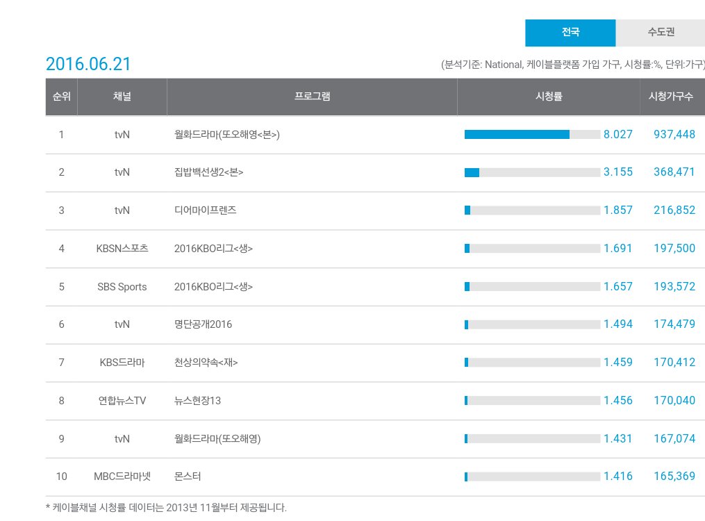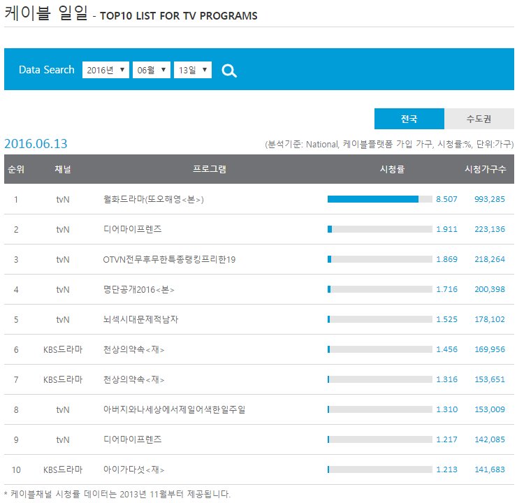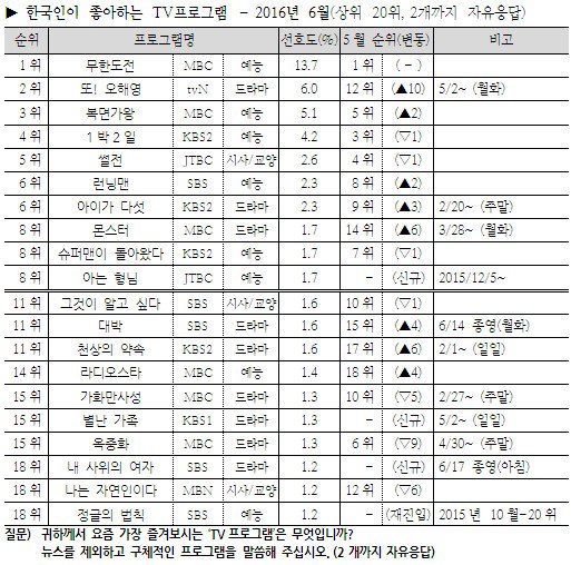 OOOO | <무한도전> 21개월 연속 1위. 공감 자아내는 대사로 여성 시청자 사로잡은 tvN 월화 심야극 <또! 오해영> 약진. <아이가 다섯> <몬스터> 꾸준한 상승세. <아는 형님> 순위권 첫 등장 t.… |