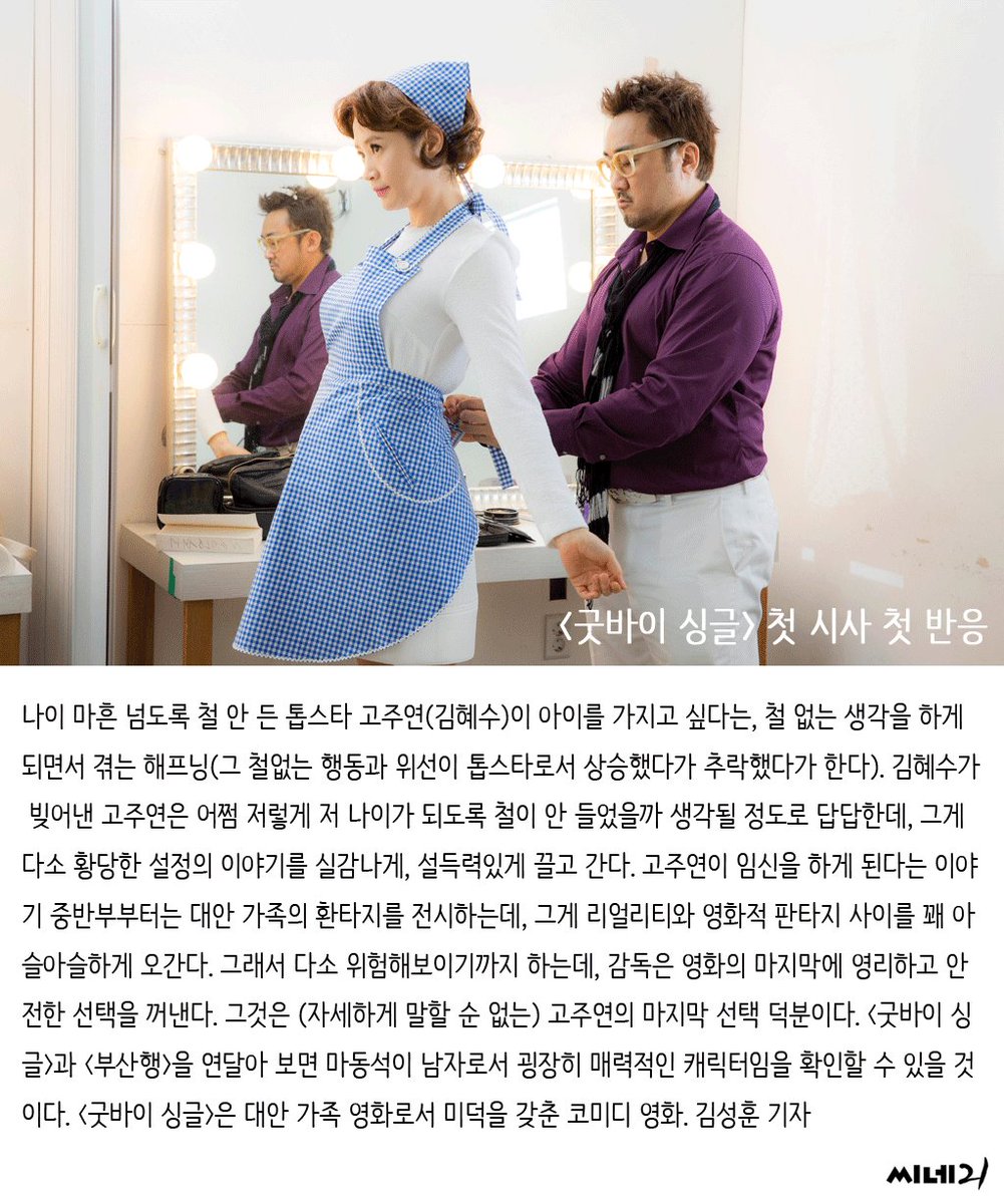 | OOOO | 6월 29일에 굿바이싱글 개봉하면 보러가야지 예고편은 그저그랬는데 코미디연기하는 김혜수에 마동석 에이프런ㅋㅋㅋ보고싶을만하잖아 |