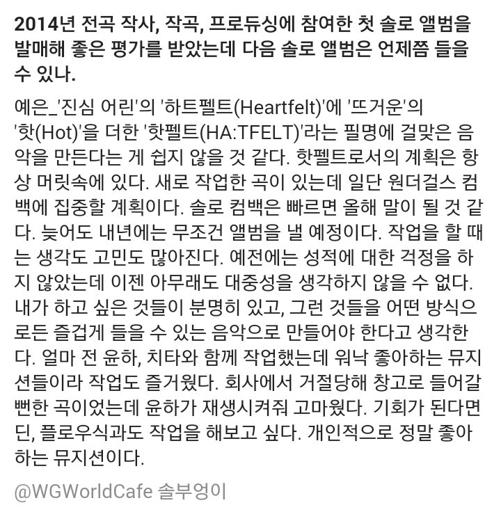 | OOOO | [#원더걸스/인터뷰] 앳스타일 2016년 7월호 솔로 활동 관련 #예은 빠르면 올해 말, 늦어도 내년 #선미 아직 정확한 컴백 계획은 없음 #유빈 이번 앨범 활동을 마친 뒤 차근차근 준비할 생각 https:/… |
