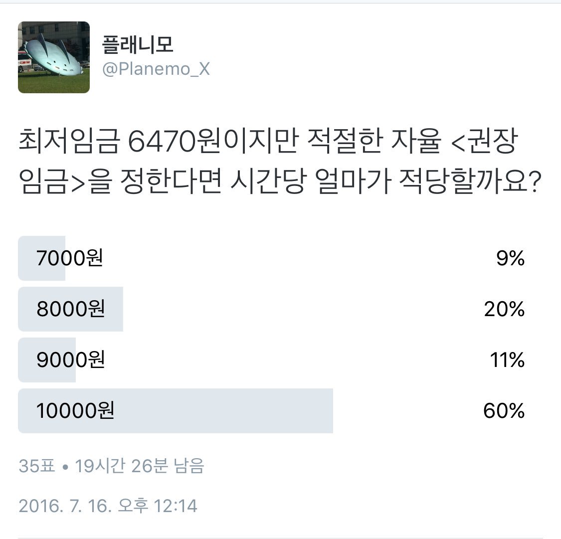 OOOO | 위 투표 최저임금 대비 권장 임금을 정한다면? 현재까지 10000원 60%, 8000원 20%, 9000원 11%, 7000원 9% |