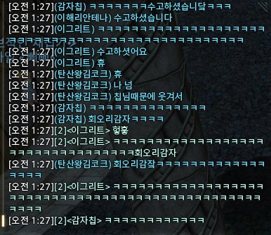 | OOOO | #레이드_첫인상 해후5:이거시! 나의! 회오리! 감자냐!(죽음) 침1:ㅇ..이거 어떻..수고하셧습니다. 침2:석화..석..석.. 악 에기야!!!!(소환사로 감) 침3:아틀님 힘내요....(같은 백만데 아틀님 학자 나 백마 포지션) 침4:시1발 |