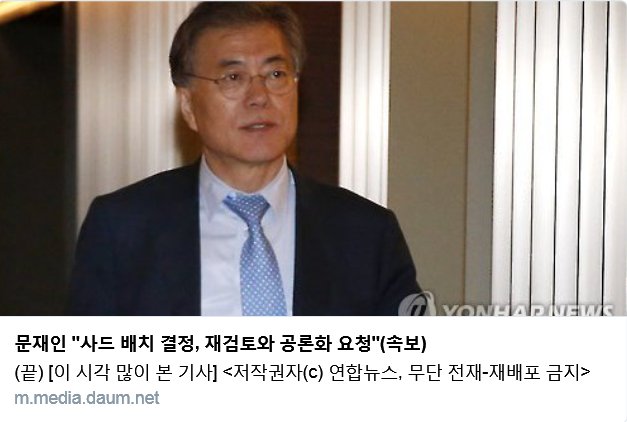 | OOOO | [속보] 한미, 사드배치 지역 경북 성주 확정① - "군사적 효용성, 지역주민 안전 등 고려" - "최적의 부지로 평가…한·미 국방장관 승인" - "성주 배치되면 대한민국 절반 이상 북핵 방어 가능" |