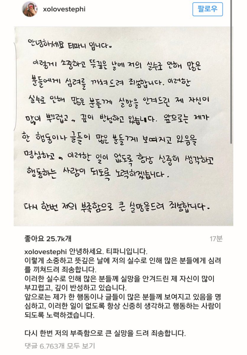 | OOOO | SNS 논란 티파니, 자필 사과문 게재 제 자신이 부끄럽다, 깊이 반성 중(전문) |