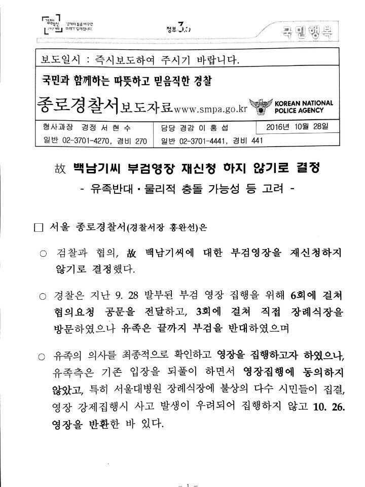 | OOOO | 경찰이 백남기 농민의 부검영장을 재신청하지 않기로 결정했다고 하네요. |