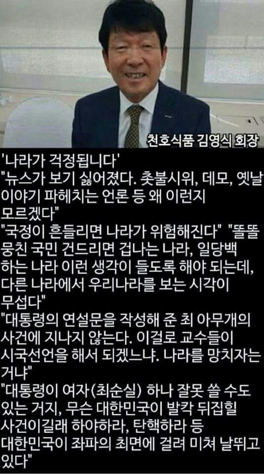 OOOO | 천호식품 회장이 인터넷에 올린 동영상과 글 '대한민국이 좌파의 최면에 걸려 미쳐 날뛰고 있다' '대통령이 여자 하나 잘못 쓸수도 있는거지 무슨 대한민국이 발칵 뒤집힐 사건이길래 하야 하라 탄핵하라고 하느냐' https:/… |