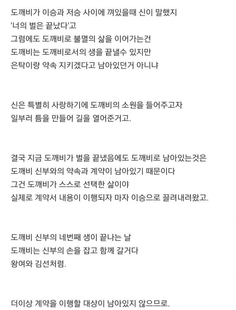 | OOOO | 와 도깨비 작가가 캐릭터를 너무 사랑해서 결국 전생에 현생에 후생까지 모두 구원해주고 싶어서 안간힘을 쓴 결과 나름 해피엔딩이다 ㅋㅋㅋㅋ |
