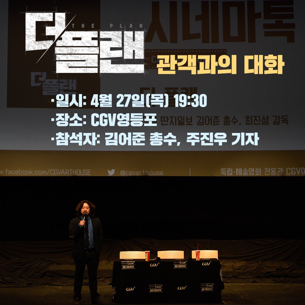 | OOOO | #더플랜 관객과의 대화! 다음 주에도 이어나갑니다!! 4.27(목) 19:30 CGV영등포 4.28(금) 19:00 아트나인 #예매오픈 #무한공유 #주진우 기자 #김어준 총수 #최진성 감독 참석 |